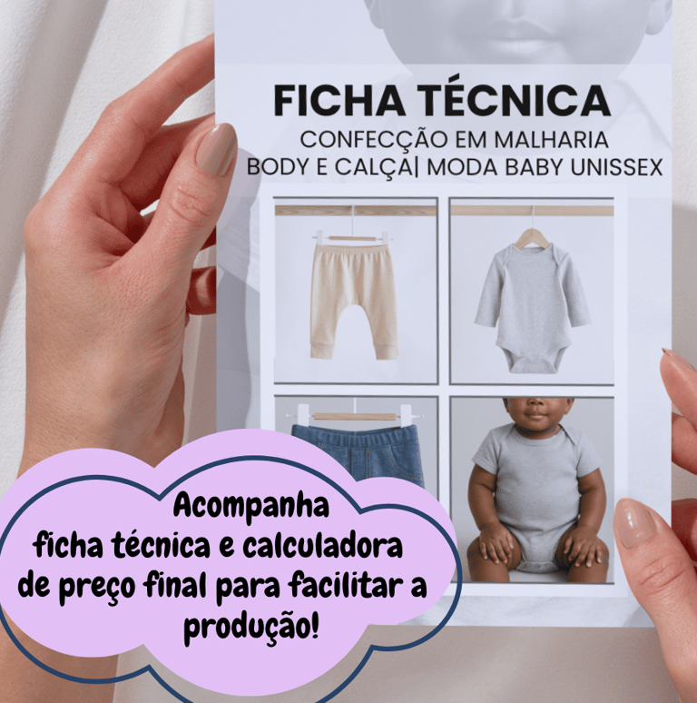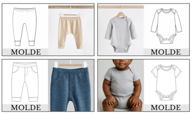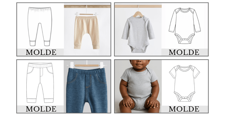 Neste kit você terá em suas mãos 2 modelos de body, manga curta e manga longa + 2 modelos de calças (Mijãozinho e calça estilosa), tudo no encaixe do tecido e com ficha técnica — moldes prontos para criar e produzir com agilidade.