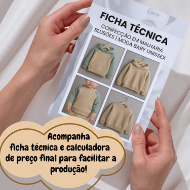 Kit com modelo manga tradicional e raglan - com capuz ou gola careca + bolso canguru. Tudo no encaixe de tecido, ficha técnica e calculadora de preço final de venda!