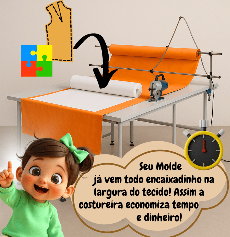Você recebe o molde em tamanho real, pronto para usar, direto na sua casa. E pra facilitar ainda mais, também enviamos uma cópia digital por e-mail — assim, se um dia quiser reimprimir ou até enviar para uma modelista fazer ajustes, o arquivo já estará com você!