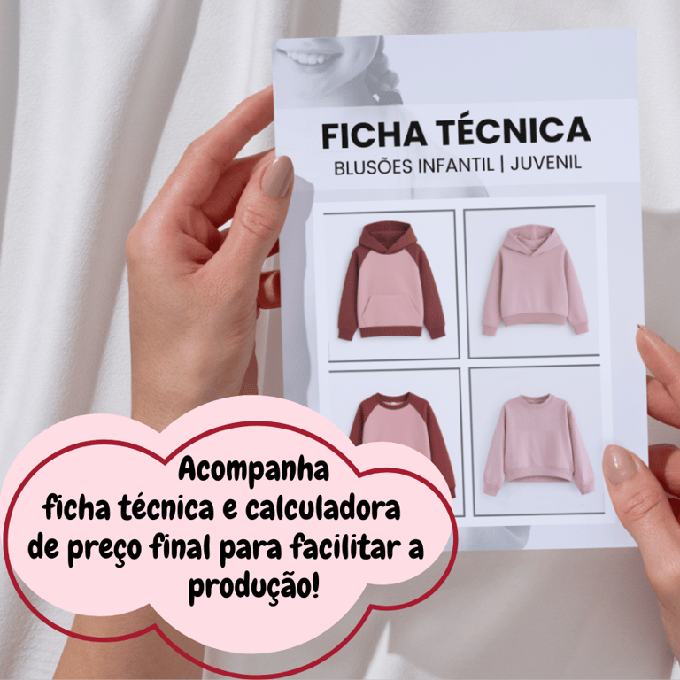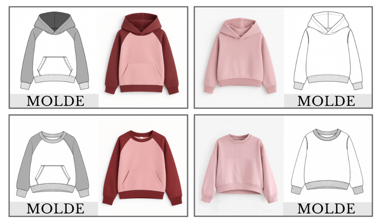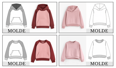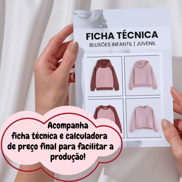 Kit com modelo manga tradicional e raglan - com capuz ou gola careca + bolso canguru. Tudo no encaixe de tecido, ficha técnica e calculadora de preço final de venda!