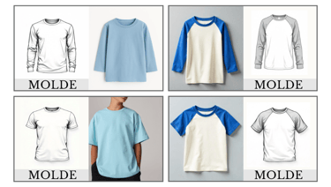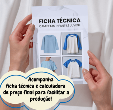 Modelos com manga normal e raglan, manga curta e manga longa, no encaixe do tecido e com ficha técnica — tudo pronto para criar e produzir com agilidade.