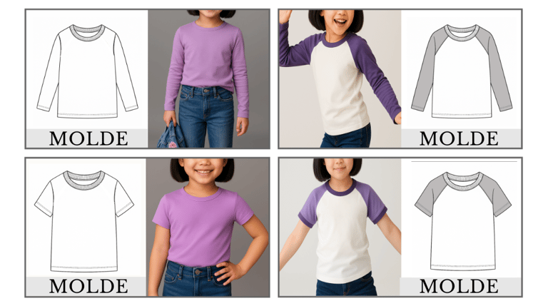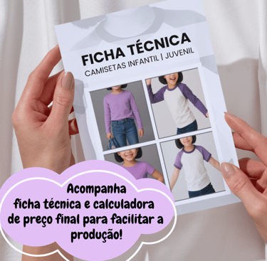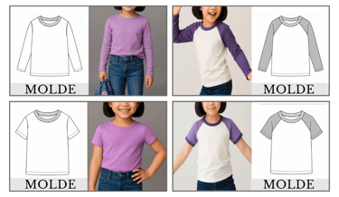 Modelos com manga normal e raglan, manga curta e manga longa, no encaixe do tecido e com ficha técnica — tudo pronto para criar e produzir com agilidade.