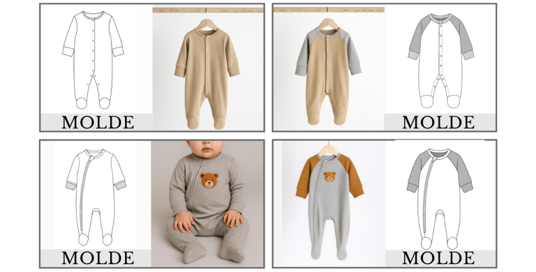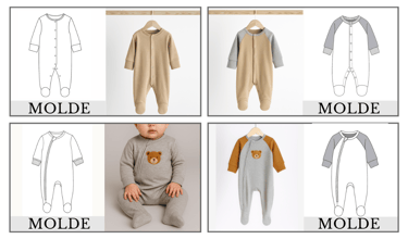 Nossa linha de Kits da Coleção Amor de Mãe, traz os moldes que mais vendem no universo da moda bebê. Fáceis de montar e fáceis de adaptar este Kit de Moldes de peças clássicas podem virar vários outros modelos com pequenos ajustes.