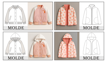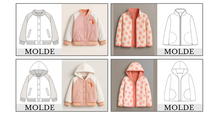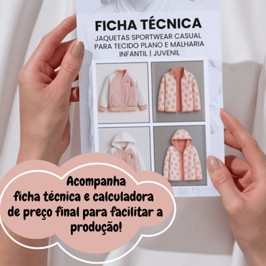 Modelos com manga normal ou raglan, capuz ou gola alta — estilo college e sportwear dupla face! Tudo isso em um só kit estratégico: moldes que se encaixam como LEGO, já no encaixe da largura do tecido e com ficha técnica. Produza com facilidade, agilidade e toque profissional!