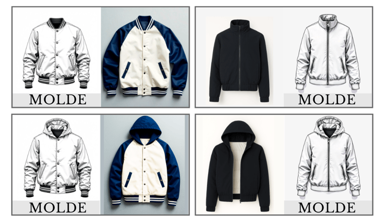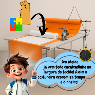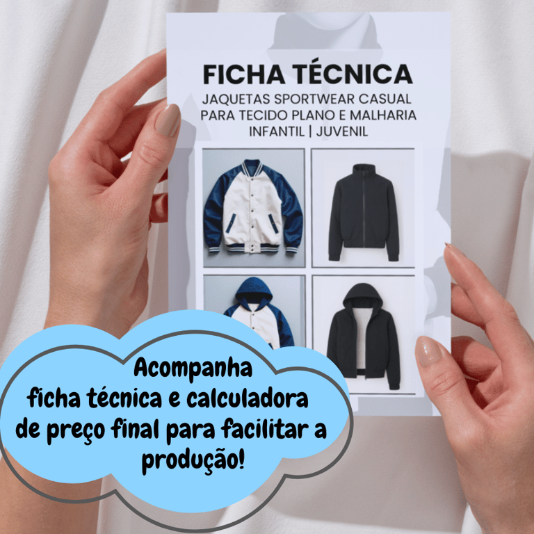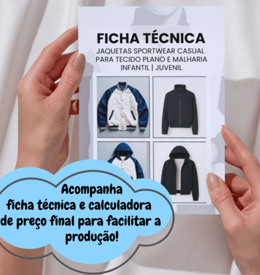 Modelos com manga normal ou raglan, capuz ou gola alta — estilo college e sportwear dupla face! Tudo isso em um só kit estratégico: moldes que se encaixam como LEGO, já no encaixe da largura do tecido e com ficha técnica. Produza com facilidade, agilidade e toque profissional!