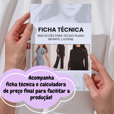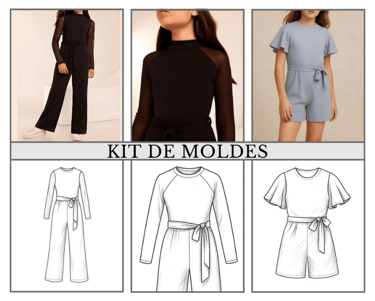 Kit com modelo de macacão longo manga (tradicional e raglan) e macaquinho manga curta godê (esvoaçante). Tudo no encaixe de tecido, ficha técnica e calculadora de preço final de venda!