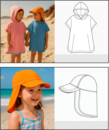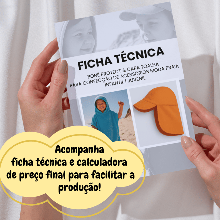 Kit com modelo de boné com tecido protetor até a nuca + capa toalha com capuz para Praia e Piscina. Tudo isso no encaixe da largura do tecido, ficha técnica e calculadora de preço final de venda!